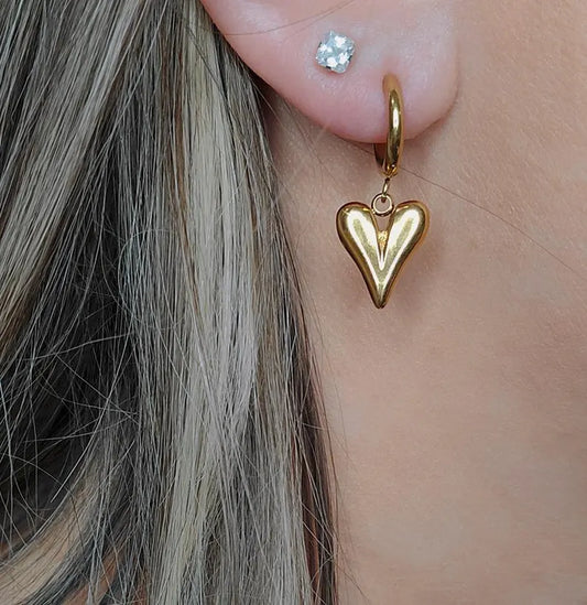 Handmade Stainless Steel Heart Charm Huggie Earrings, Available in Gold or Silver!