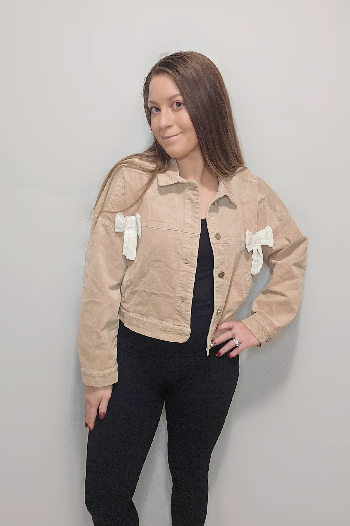 Meet your new favorite layer! This 100% cotton corduroy jacket is here to add personality to your closet with its adorable bow detail and convenient pockets. The soft, textured fabric feels amazing against your skin while the button front makes getting dressed a breeze. Whether you're running errands or grabbing coffee with friends, this playful piece brings instant charm and comfort to any look.